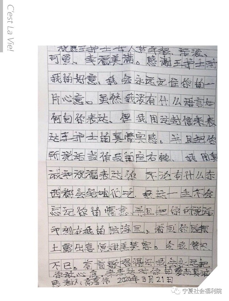 2020年,因一场新冠肺炎疫情的突袭,我们度过了最特殊的一段时光,艰难、辛苦,却也充满了感动与温暖。近日,宁夏社会福利院福泽区的王香护士收到了一封来自患者的感谢信,感谢她一直以来对他精心细致的点滴关照。一封感谢信,言简情深,字里行间流露出对科室医护人员的感激之情,真挚的话语让全科医护人员感受到阵阵暖心和欣喜,患者用心写下的感谢信是对我院工作的最大肯定,渗透出了浓浓的医患情,也传递了特殊时期最真挚的情感。